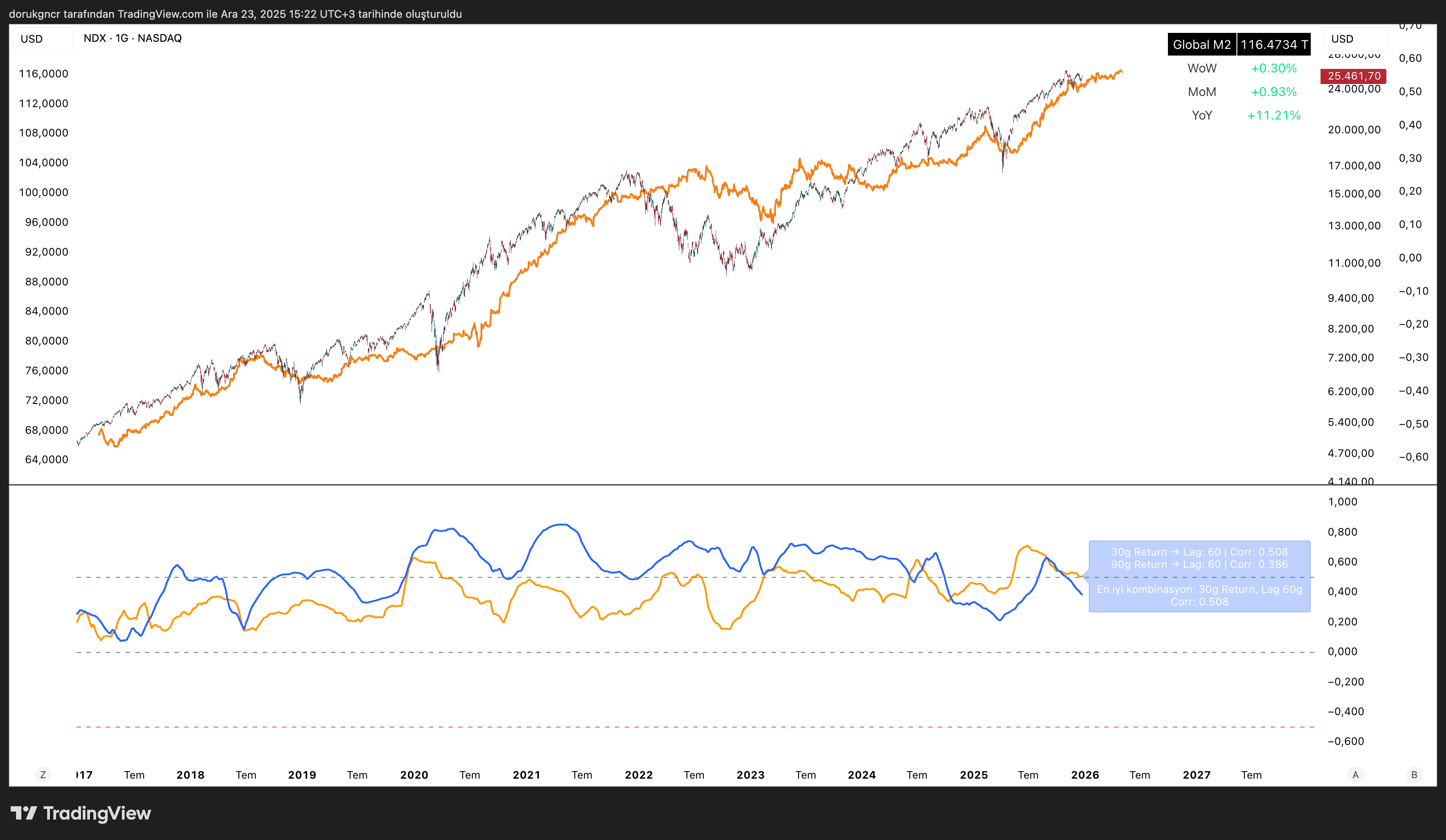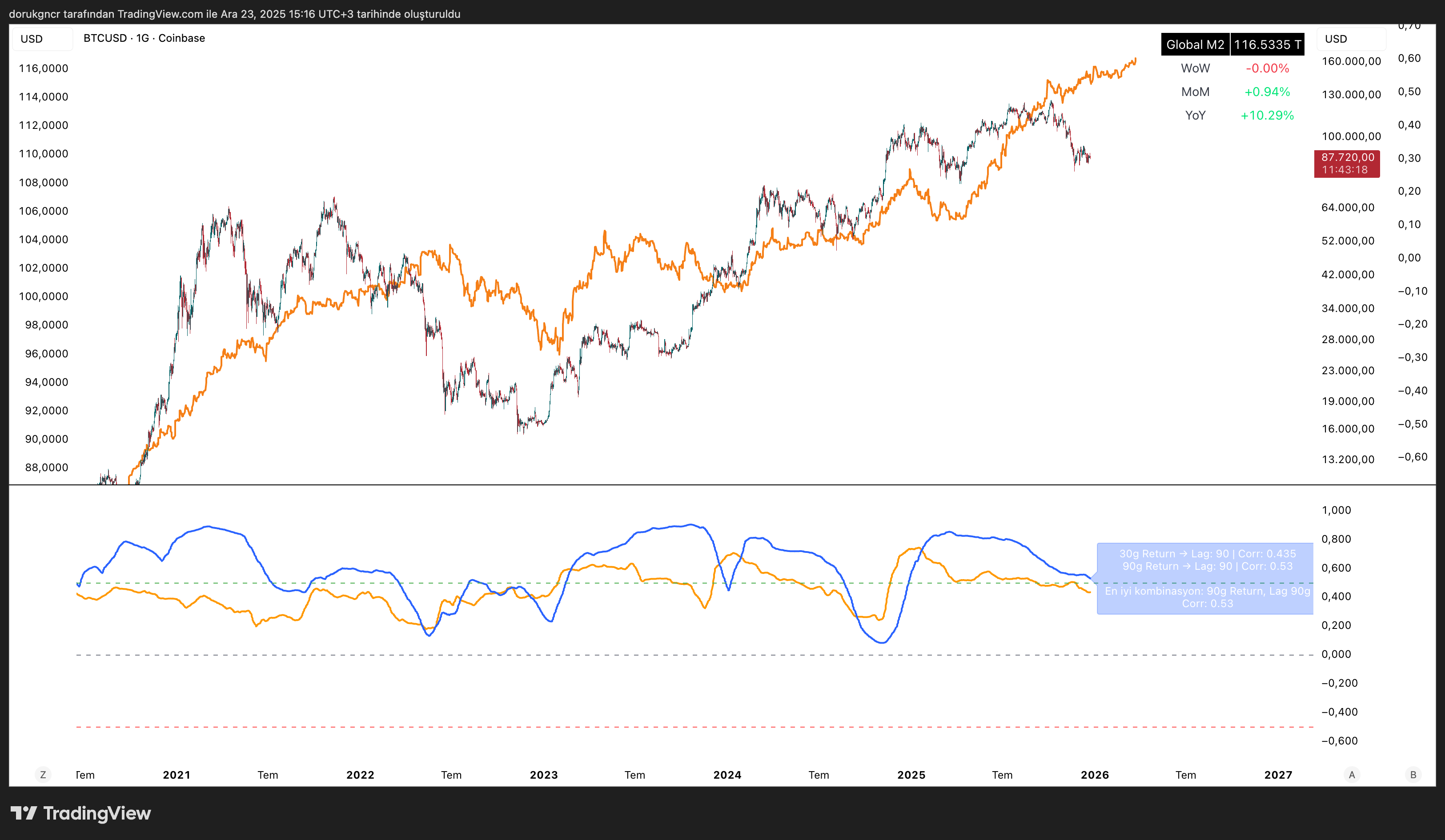 Grafik üzerindeki turuncu grafik M2’nin 90 gün ileri kaydırılmış görselidir. Aşağıda yer alan panel ise M2 ile Bitcoin arasındaki en yüksek korelasyonu bulmaz üzere 30-90 günlük getiri ve 30 - 60 - 90 - 120 - 180 lag (gecikme) taraması yaparak en yüksek korelasyonu bulur.