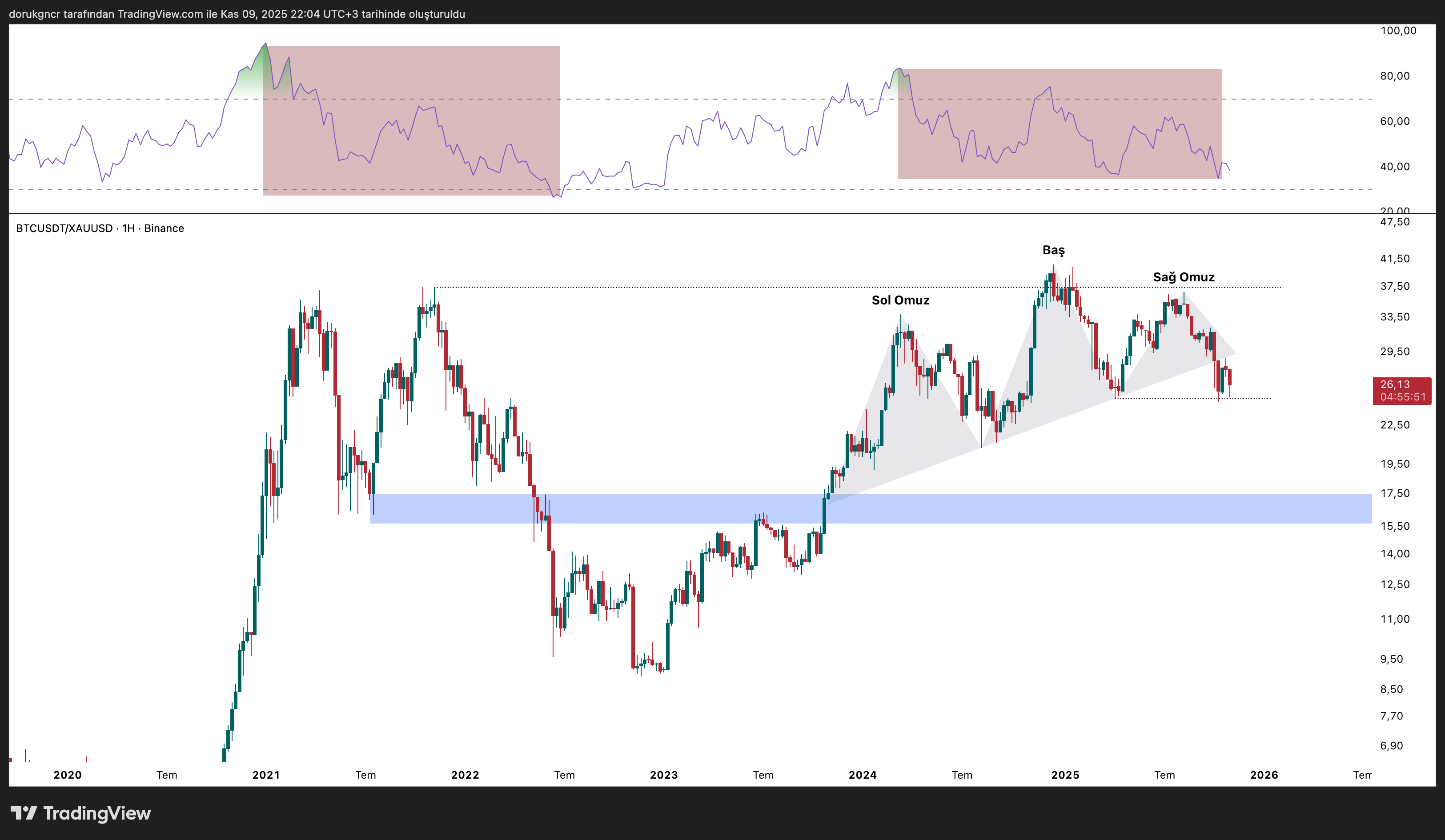 2021 Kripto para düşüşü ve altın yükselişi öncesi çift tepe + RSI uyumsuzluğu ile karşılaştığımız bir grafik mevcuttu. Güncel grafiğe odaklandığımızda TOBO oluşumu ile RSI uyumsuzluğu bizleri karşılıyor. Buraya kadar tüm her şey negatif olsa bile pozitif olabilecek şekilde yorumladığım bir durum ise RSI önceki dip seviyesine gelmesidir.