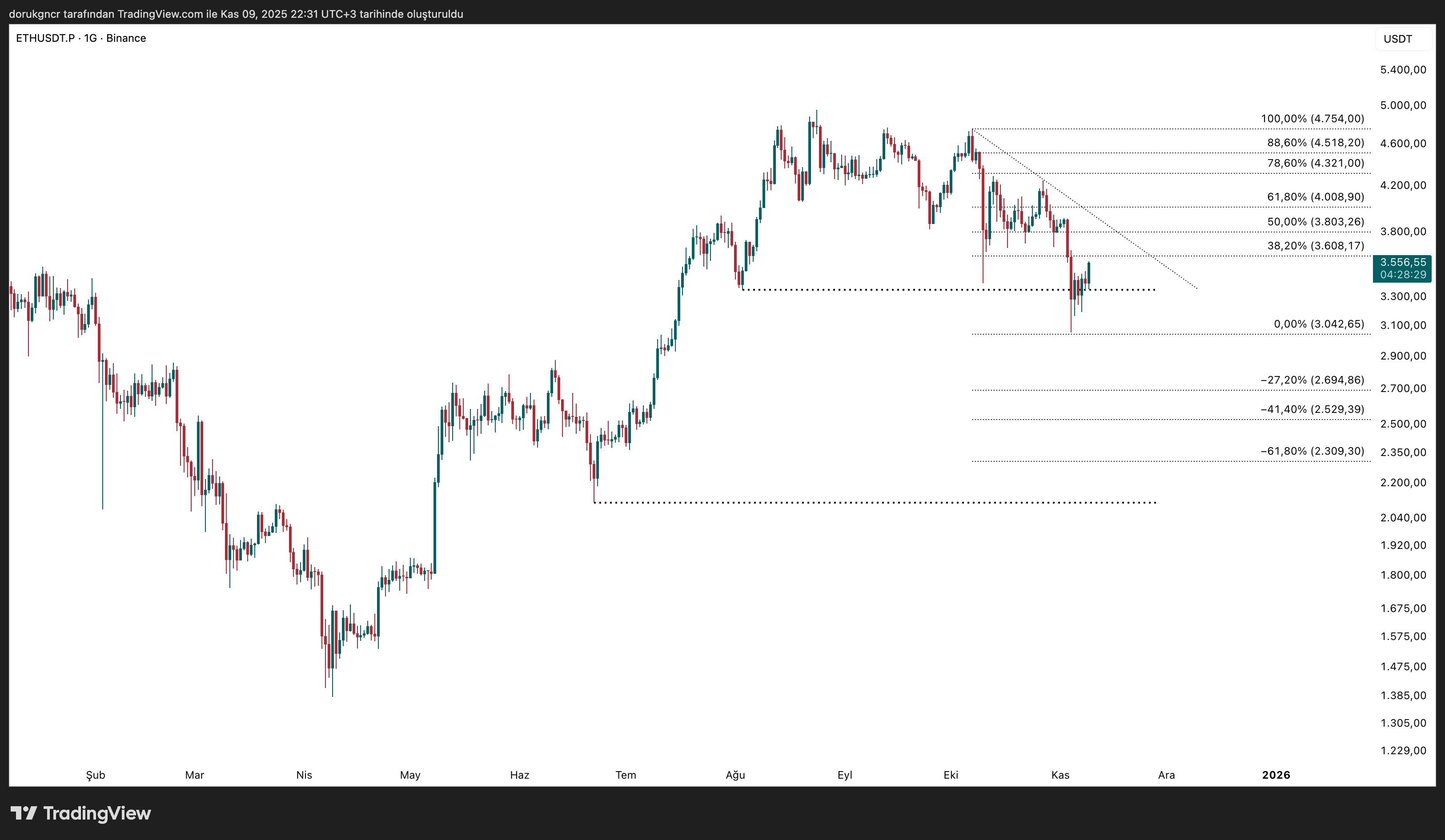 Altında belirli aralıklarda %8-10 arası düzeltme sonrasında döngüsüne devam etmekte. Grafik üzerinde AB=CD oluşumu söz konusu ve tam 1 seviyesinden tepki almış. Bu stratejiye göre -27,2 üzeri (4974$) stop seviyesidir. 38,2 (3518$) ve 61,8 (3105$) seviyesi ise hedef bölgeleridir.