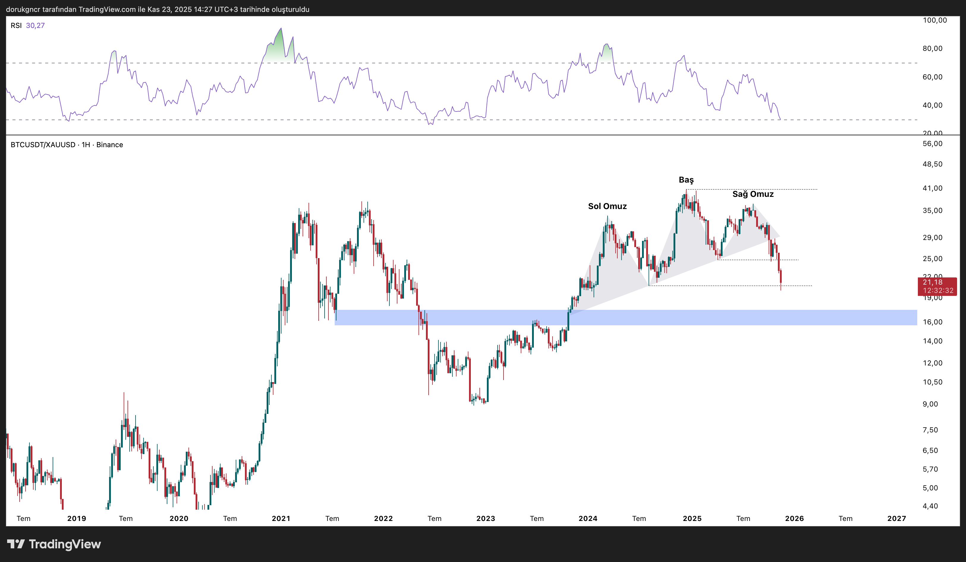 Weekly Flow - 2 yazısında bahsettiğim gibi OBO formasyonu devam etmekte. RSI, 2022 Haziran ayındaki dip bölgeye çok yakın durumda. Önceki yazıda bahsettiğim gibi, mavi bölge destek bulacağımız en sağlam seviye olabilir. Mavi bölge dışında güncel 21.17 seviyeside önem göstermekte çünkü yatay trendin dönüş yapacağı bölge tam olarak burasıdır.