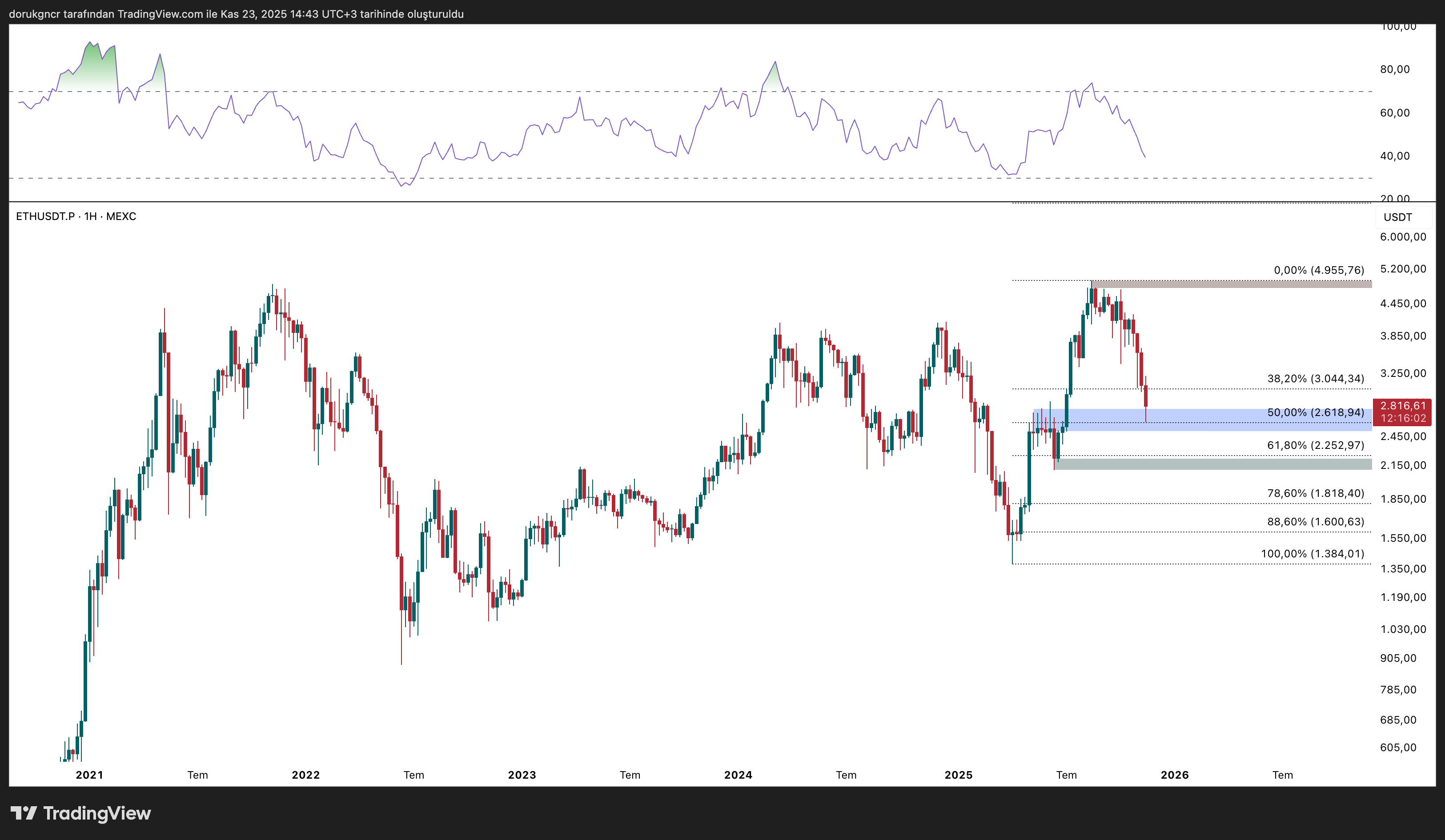 Geçtiğimiz döngüde (2021) RSI 26 seviyelerine yaklaşırken fiyatı 17.000$ seviyelerine çekmişti. Güncel durumda RSI 35 ve fiyat seviyesinde büyük bir geri çekilme söz konusu değil. Bunu yorumlama biçimim tam olarak ‘Piyasa likidite bekliyor’. Sadece beklentiler ve ‘benim’ düşüncelerim ile ilerlemek doğru olmaz. Ne de olsa biz yatırımcıyız, düşünceler bizim için havada kalır.