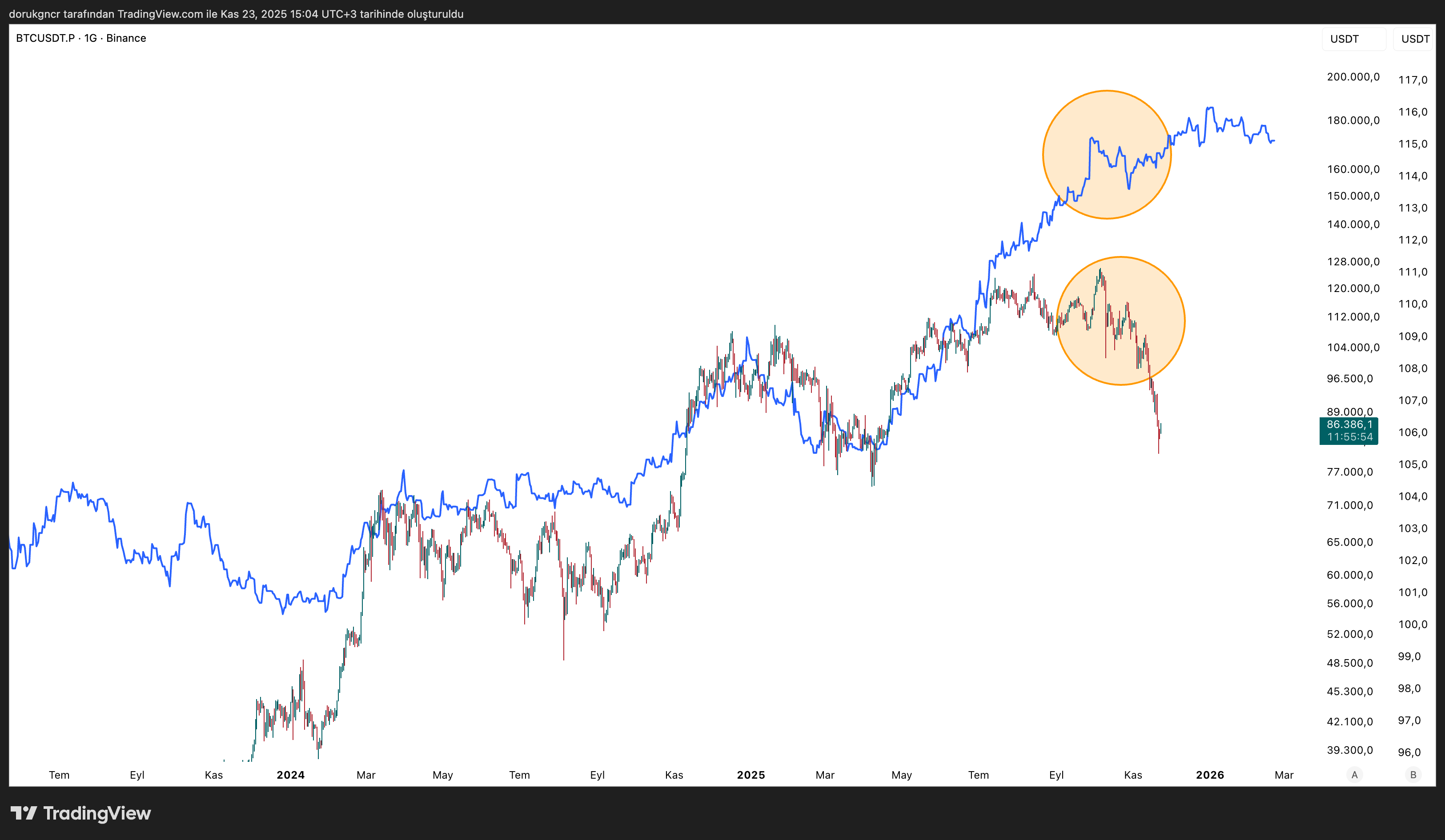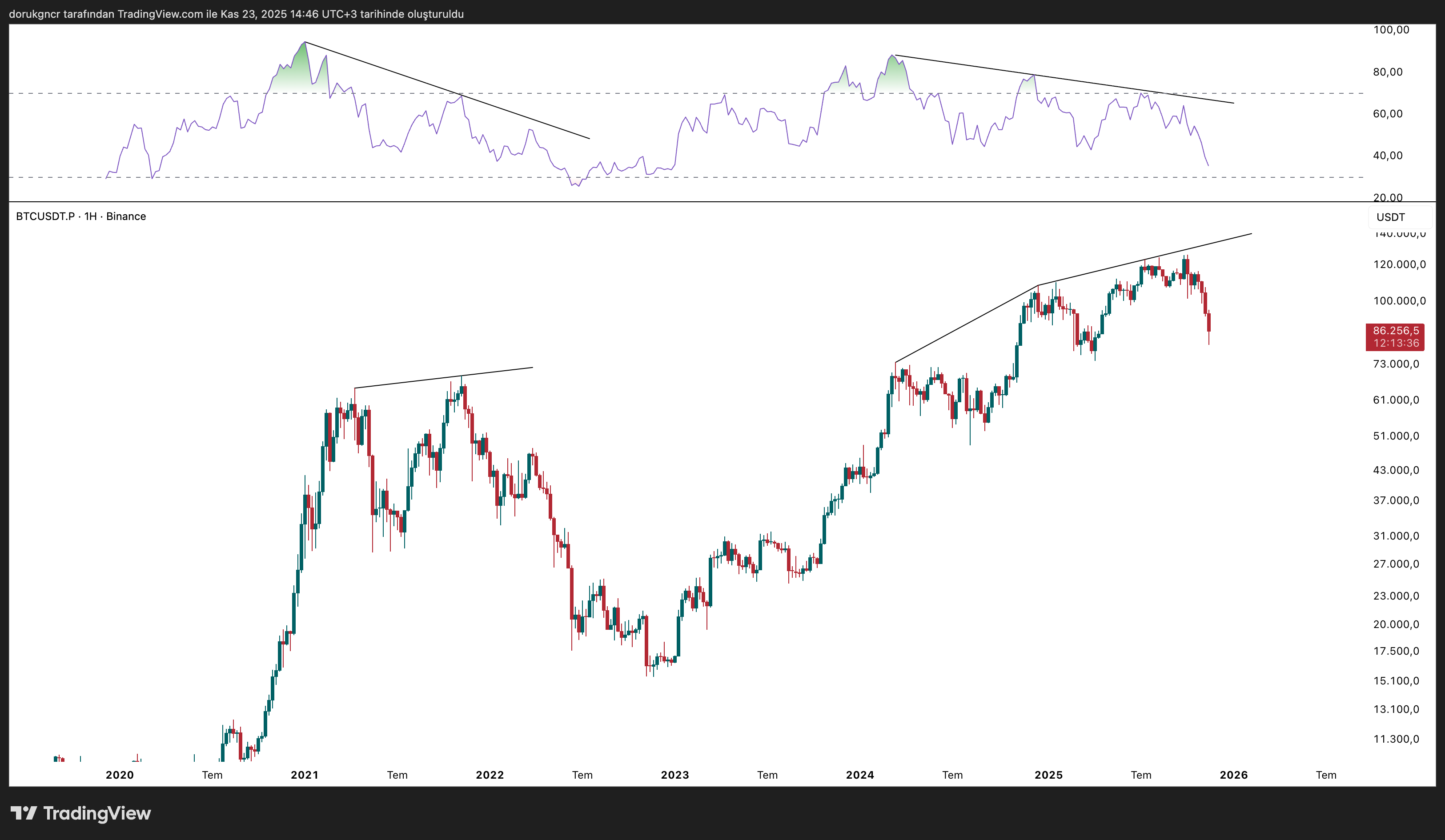 Destek-Direnç çizerek gereksiz zaman kaybetmenizi istemiyorum. Bitcoin tarafına biraz daha farklı bakacağız. Bitcoin, dünden bugüne büyük yatırımcılar tarafından kabul edilen bir yatırım enstrümanı olmuştur.\r\nStrategy (Michael Saylor) 74.430$ ortalama maliyet ile 649.870 adet Bitcoin’e sahiptir. Bu sebeple geçmiş döngülerden bugüne Bitcoin’e yatırım yapan kişiler ve yatırım stratejileri değiştiğini düşünmekteyim.