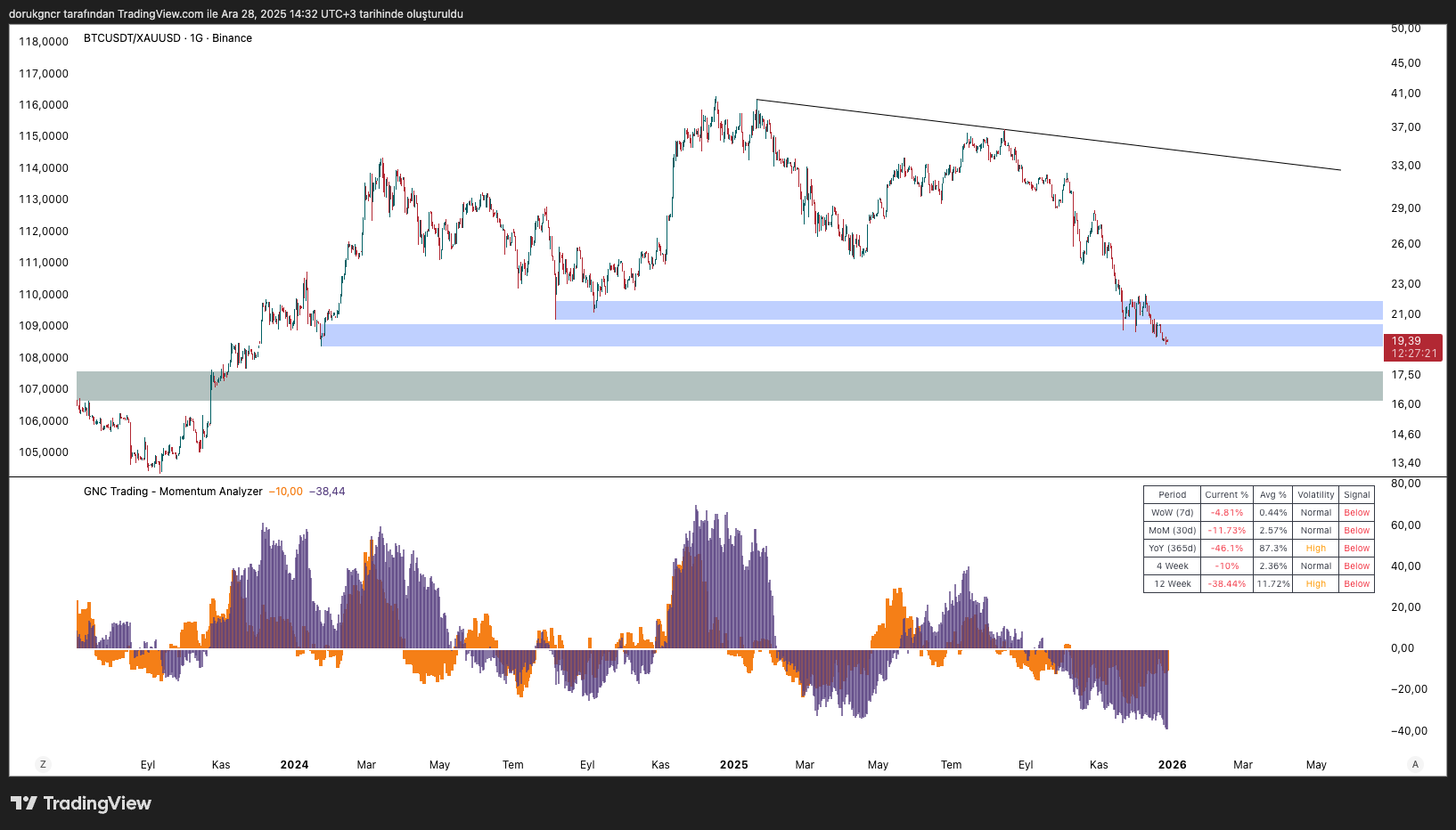 Önceki yazımdan, bu yazıma Bitcoin/Altın rasyosu 20.35 seviyesinden bugün 19.39 seviyesine geriledi. 4 ve 12 haftalık değişim negatif yönde devam ediyor.